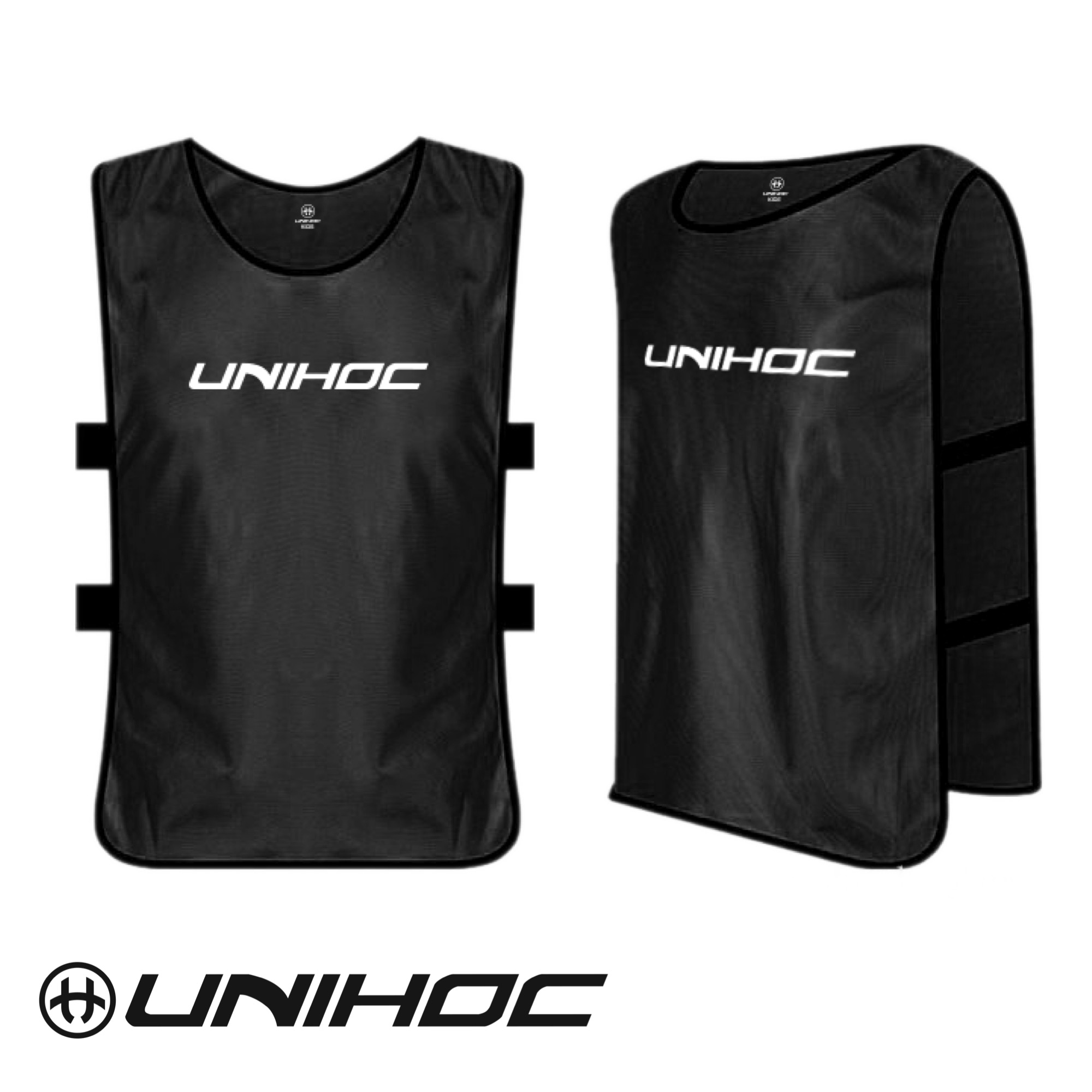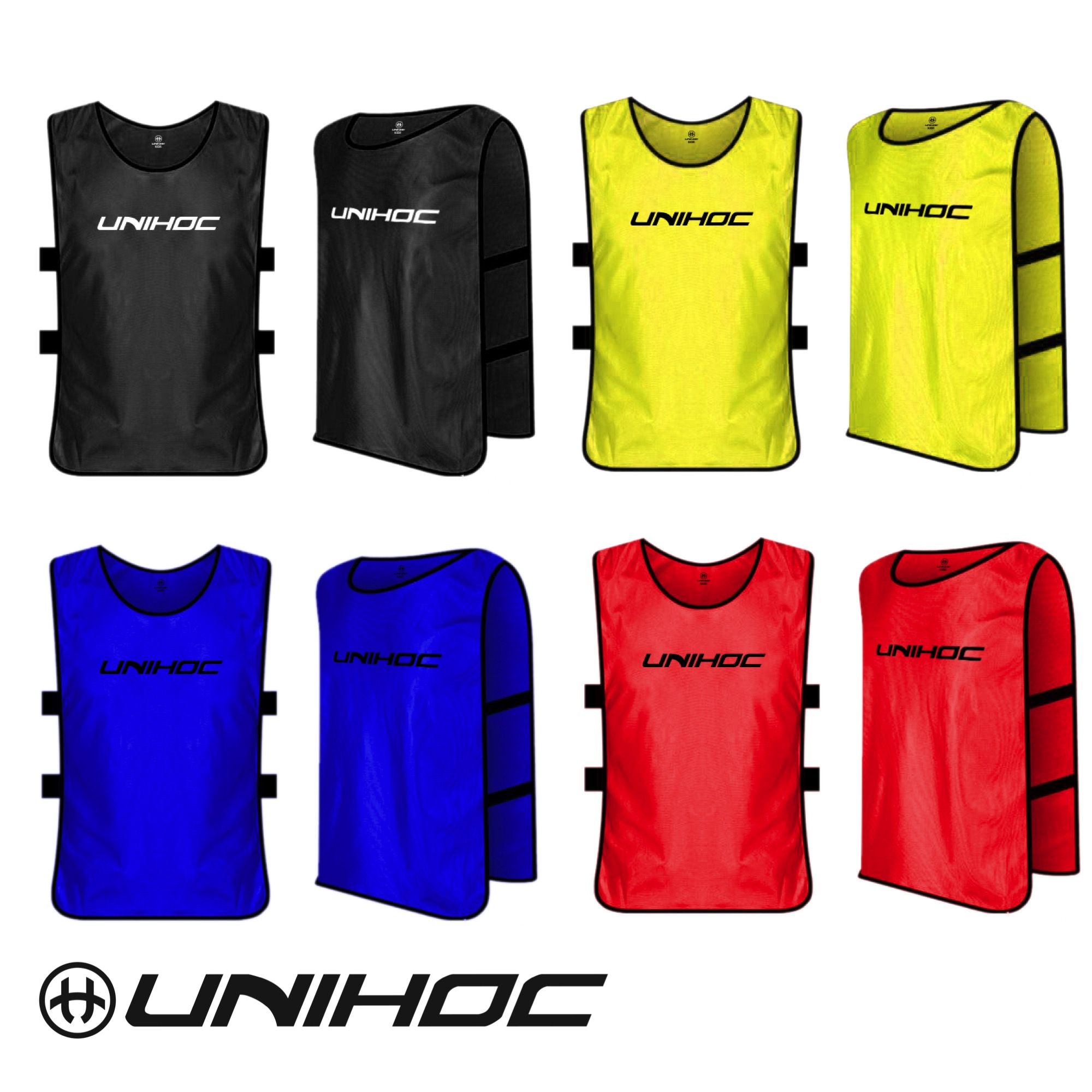 Unihoc training vests in sizes Kids, S, XL! Available in black, red, blue, and yellow.